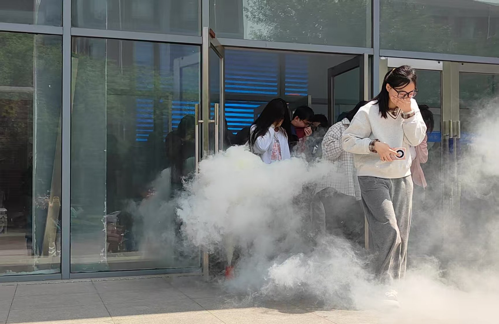 After the lecture, the students quickly gathered at the entrance on the first floor of Yifu Building. With the order given, simulated smoke rose and the evacuation drill officially began. Teachers and students bent down, covered their mouths and noses, and evacuated quickly and orderly along the pre-determined routes to the safe area outside the building. The entire process took less than five minutes, demonstrating their efficient emergency response capabilities.