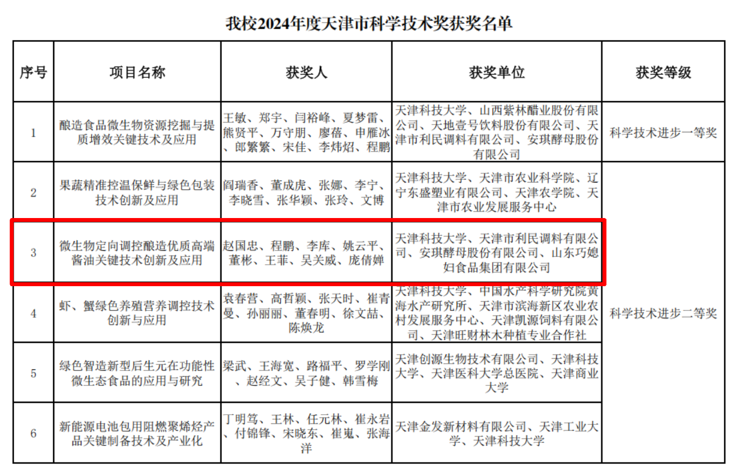 Recently, the website of the Tianjin Municipal People's Government published the "Decision of the Tianjin Municipal People's Government on Promulgating the 2024 Tianjin Science and Technology Awards", and six achievements of our university won the Tianjin Science and Technology Progress Award. Among them, the project "Key Technological Innovation and Application of Microbial Directional Regulation for Brewing High-Quality and High-End Soy Sauce" led by Professor Zhao Guozhong's team from our institute won the second prize of Tianjin Science and Technology Progress Award in 2024.